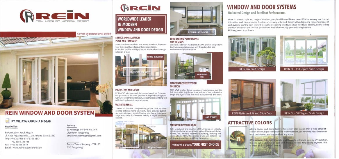 Kini PT. Wijaya Karunia Megah menghadirkan produk REIN kusen jendela uPVC yang menggunakan profile ex-Jerman yang tentunya berkualitas terbaik. Kami menjamin jendela yang tahan lama, kedap suara dan tahan terhadap iklim atau cuaca Profil Rein uPVC kami merupakan material yang ramah lingkungan sehingga bisa di daur ulang. Selain itu juga kami menjamin jendela yang tahan lama, kedap suara dan tahan terhadap iklim atau cuaca